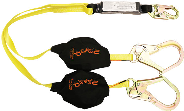 - Z74 locking snaphook on harness end (3/4 in opening), two qty Z136 locking rebar snaphooks on lanyard legs (2-1/2 in gate openings)