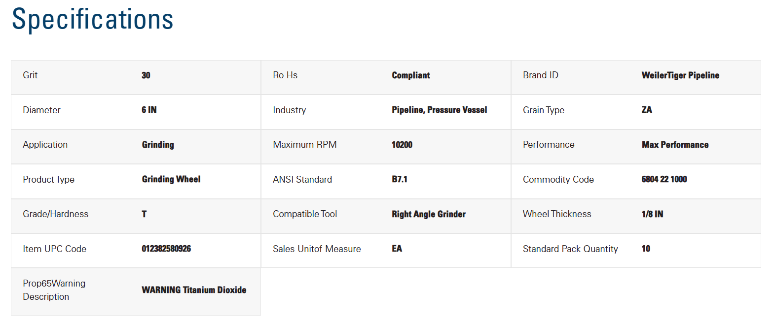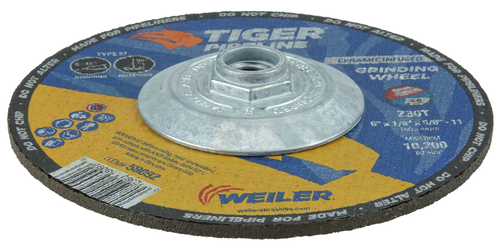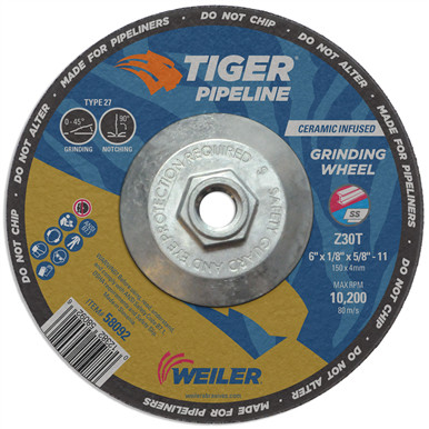 Weiler’s 6 inch Tiger Pipeliner Grinding Wheels are designed specifically for pipeline applications. Whether grinding a bead, facing the land, prepping transitions, or fabricating in the yard, this 1/8 inch thick wheel (aka bead grinder, grinder disc) delivers aggressive grinding and reduced chatter throughout the life of the wheel. Hitting a grinding wheel with a file to make it work is a waste of time, shortens wheel life, but most importantly it’s unsafe. Tiger Pipeliner Grinding Wheels are designed to work right out of the box and continue to dig in throughout the life of the wheel. Operators will no longer feel the need to chip the wheel to get it to bite.