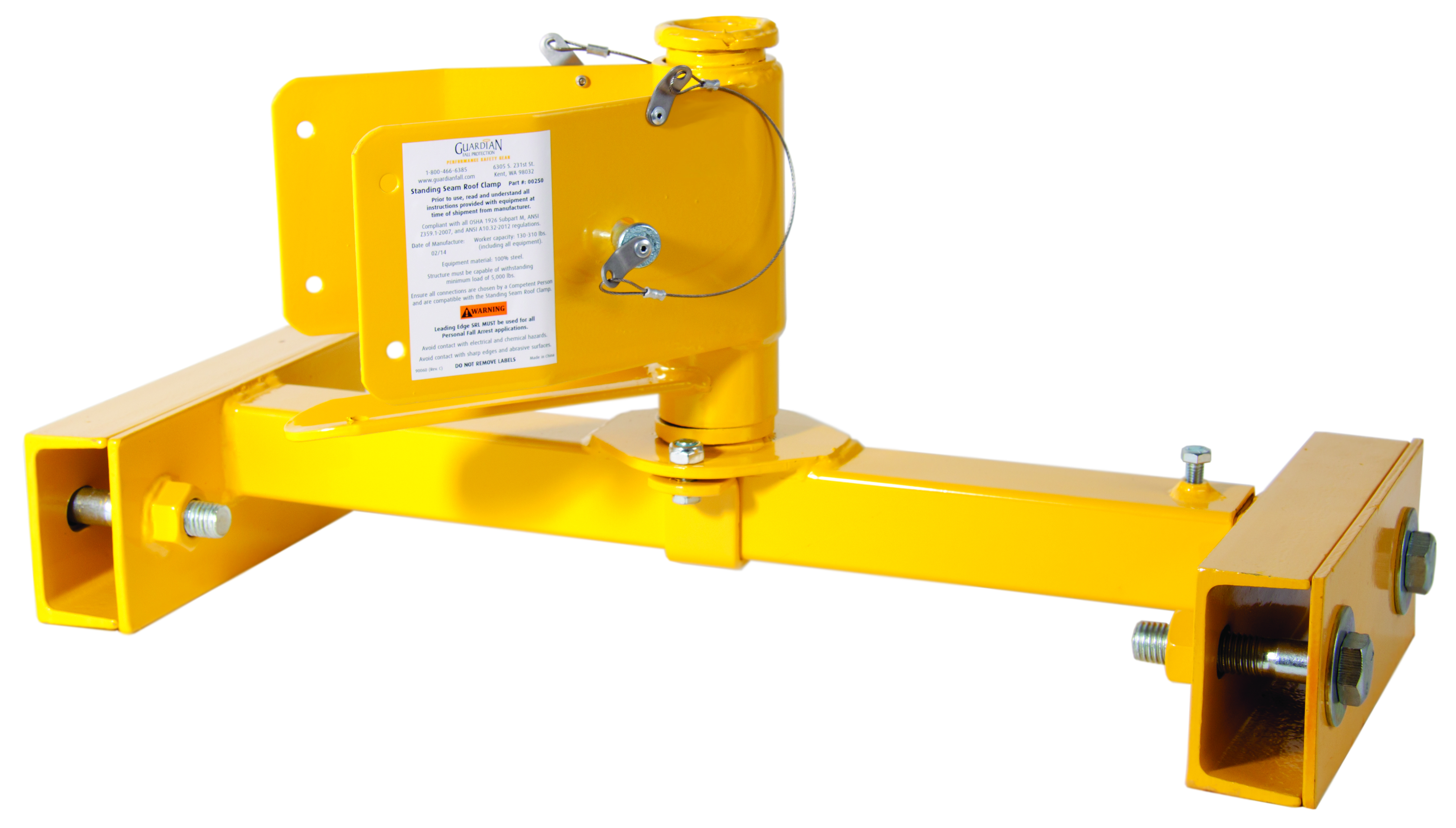 The guardian fall protection standing seam roof clamp is designed for used with srls up to 50 feet in length (or up to 65 feet in length if used in combination with the retractable swivel adapter). It functions to attach to metal roof seams spaced from 24 to 36 inches apart, while allowing the attached srl to rotate a full 360 deg.