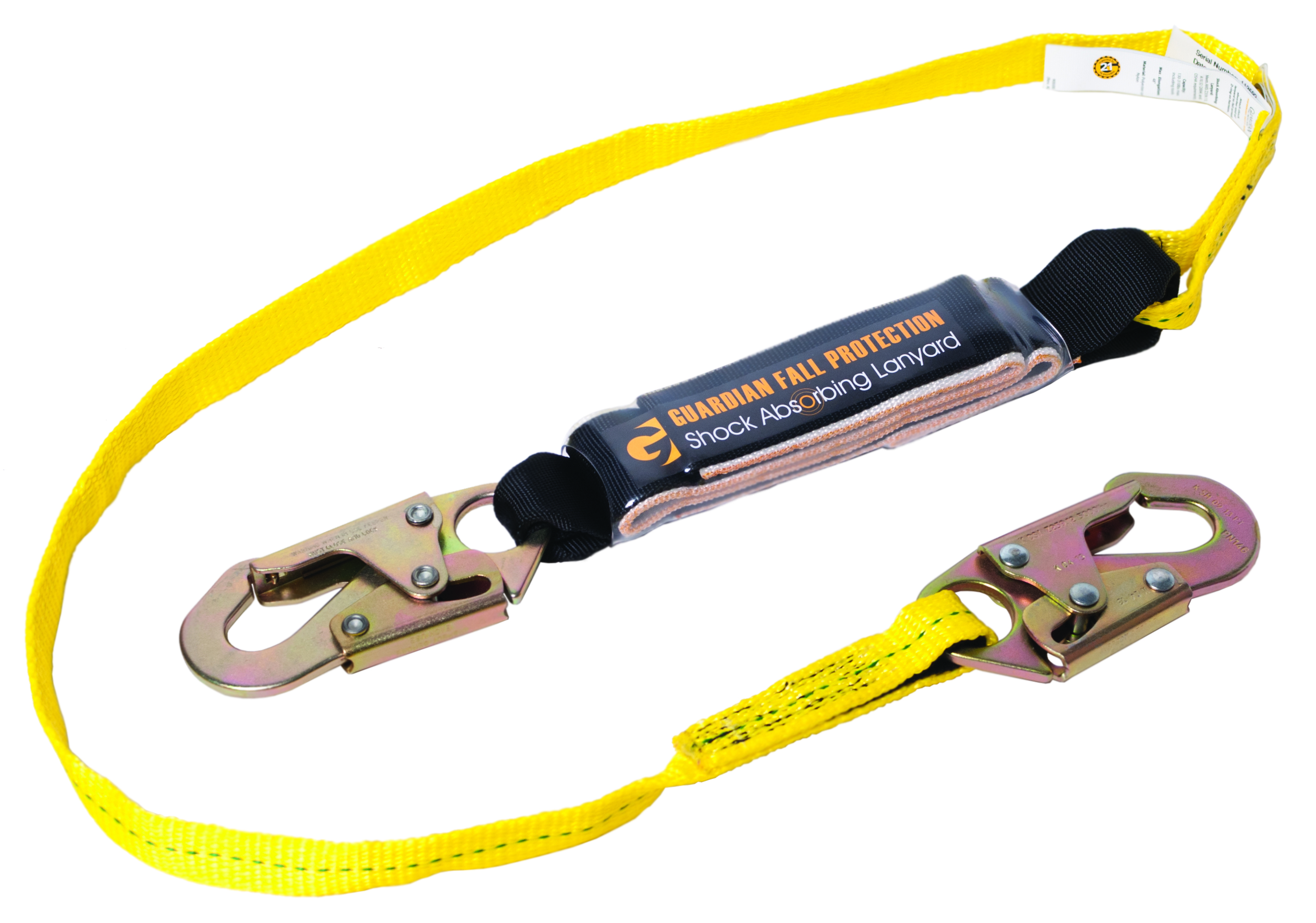 The Shock Absorbing Lanyard is the premiere free fall lanyard offered by Guardian Fall Protection. It meets all the stringent ANSI Z359.13-2013 regulations, and the integrated shock absorbing component limits average arresting forces to 900 lb or less. It is comprised of 1 in nylon webbing and is available in a variety of lengths and connector options, including steel and aluminum snap hooks and rebar hooks, all of which make it one of the most functional and durable lanyards on the market.