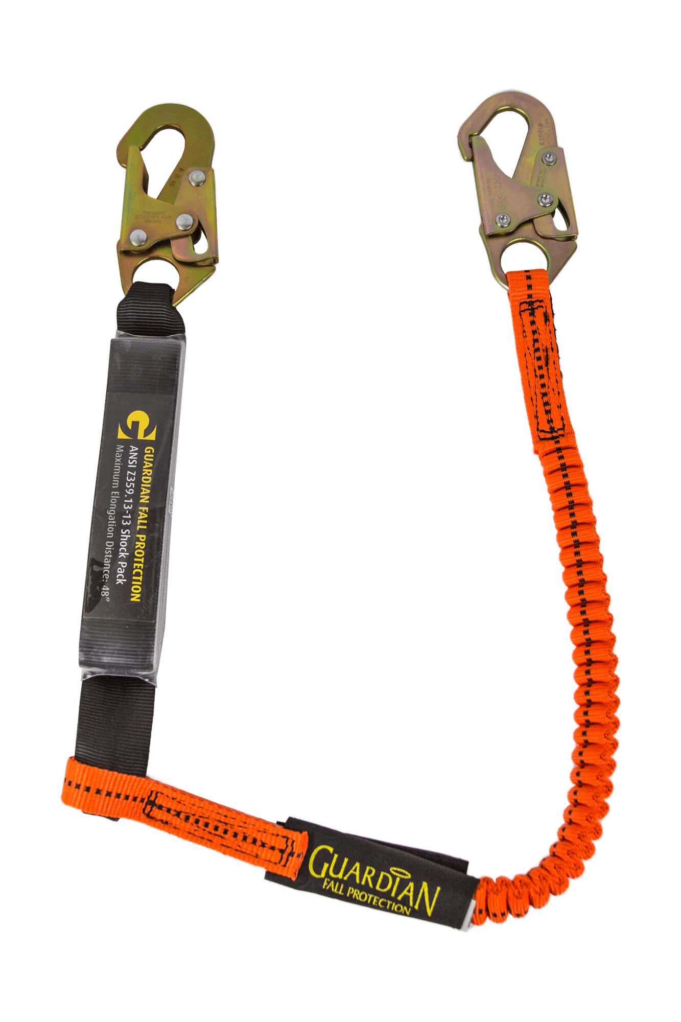 The Guardian Fall Protection Tiger Tail stretch lanyard is ideal for Fall Arrest applications in tight spaces or around moving machinery, since its stretching capability helps reduce hazards of tripping or catching on moving parts. This lanyard stretches from between 4-1/2 to 6 ft, and includes an integrated shock absorbing component. It has been consistently tested to reduce forces of arrest to fewer than 900 pounds, and has one of the most consistent deployment rates of any stretch lanyard on the market. It is available in both single and double leg models, as well as with a variety of connector options.
