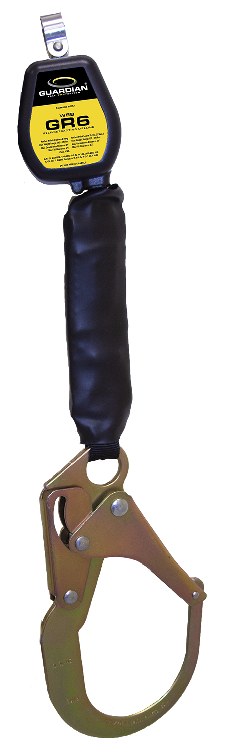 The Guardian GR6 is so lightweight, youll almost forget you are wearing it. At a mere 1.7 lbs. and 3.3 X 2.5 X 2.5 in, the GR6 is the smallest and lightest SRL in its class - but weight is the only thing it gives up. The GR6s housing is constructed from UV-stabilized, high-strength polycarbonate/ABS and surrounds an incredibly strong steel load-bearing chassis. The sealed housing helps keep out dirt and other contaminants, providing extra protection for the internal components. Its HMPE webbing is ultra-lightweight and abrasion-resistant for a long life and is perfect for applications like solar that benefit from a more supple lifeline. Available with steel or aluminum snap or rebar hooks, the GR6 is a perfect fit in general industry, maintenance, and rebar applications.
