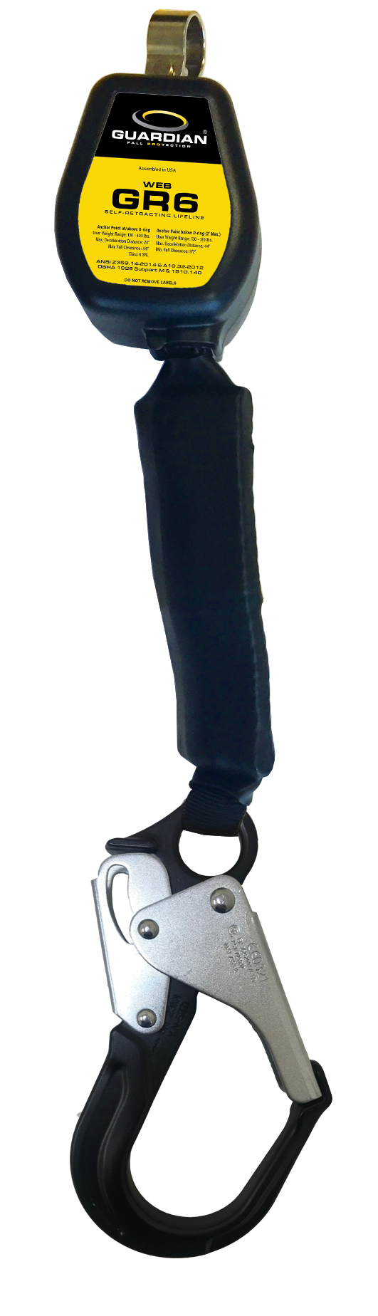 The Guardian GR6 is so lightweight, youll almost forget you are wearing it. At a mere 1.7 lbs. and 3.3 X 2.5 X 2.5 in, the GR6 is the smallest and lightest SRL in its class - but weight is the only thing it gives up. The GR6s housing is constructed from UV-stabilized, high-strength polycarbonate/ABS and surrounds an incredibly strong steel load-bearing chassis. The sealed housing helps keep out dirt and other contaminants, providing extra protection for the internal components. Its HMPE webbing is ultra-lightweight and abrasion-resistant for a long life and is perfect for applications like solar that benefit from a more supple lifeline. Available with steel or aluminum snap or rebar hooks, the GR6 is a perfect fit in general industry, maintenance, and rebar applications.