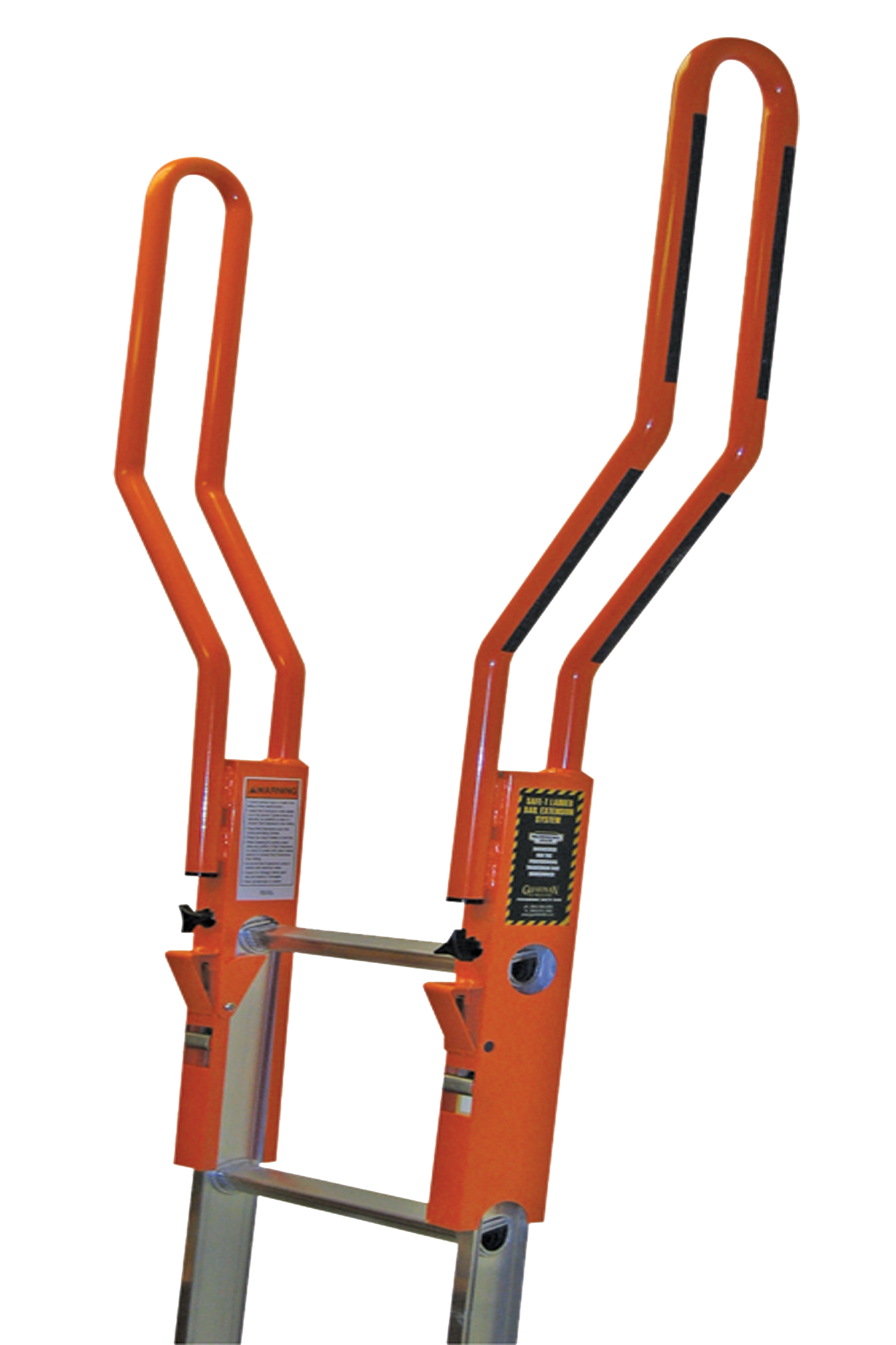 The Guardian Fall Protection Safe-T Ladder Extension System is designed to attach to the top of a ladder to provide a safe and easy transition from the ladder to a raised surface. It requires no tools, drilling, or bolting to install, and is one of the most effective means of improving the safety of nearly any ladder. Once installed, it provides 2 offsetting handrails that offer a point of walkthrough to step on or off the ladder. This patented piece of equipment assists workers in complying with OSHA standard 1926.1053(b), which states, “When portable ladders are used for access to an upper landing surface, the ladder side rails shall extend at least 3 feet (.9 m) above the upper landing surface to which the ladder is used to gain access.” The Safe-T Ladder Extension is incredibly simple to use, tightens onto a ladder by hand, and will never scratch or damage the ladder to which it is attached. The unit has a safety latch that prevents it from slipping off the ladder, it is specially designed with cushioned bumper pads to help protect the eave of the roof, and its handgrips help ensure maximum safety.