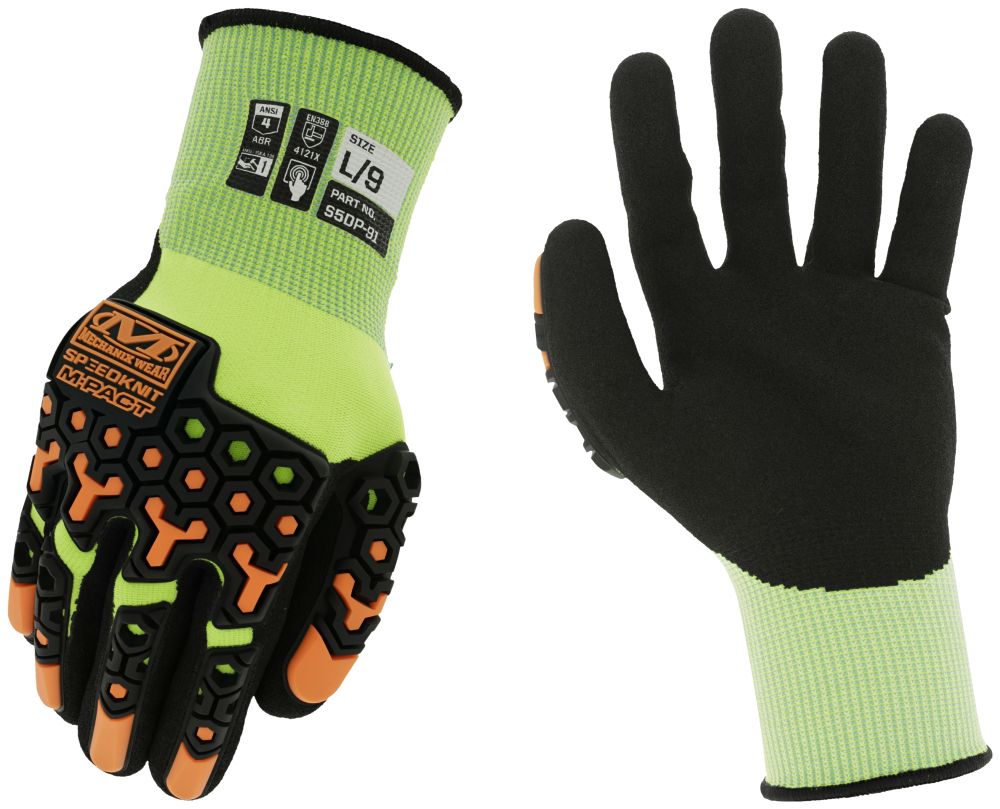 Our SpeedKnit M-Pact Hi-Viz S5DP91 work gloves are designed to protect working hands with a combination of functional impact resistance and proven abrasion resistance. We use a machine-knit blend of 15-gauge nylon coated with sandy nitrile to achieve ANSI Level 4 abrasion resistance. Our ergonomically designed TPR is sonic welded for a seamless fit and ANSI Level 1 impact resistance.