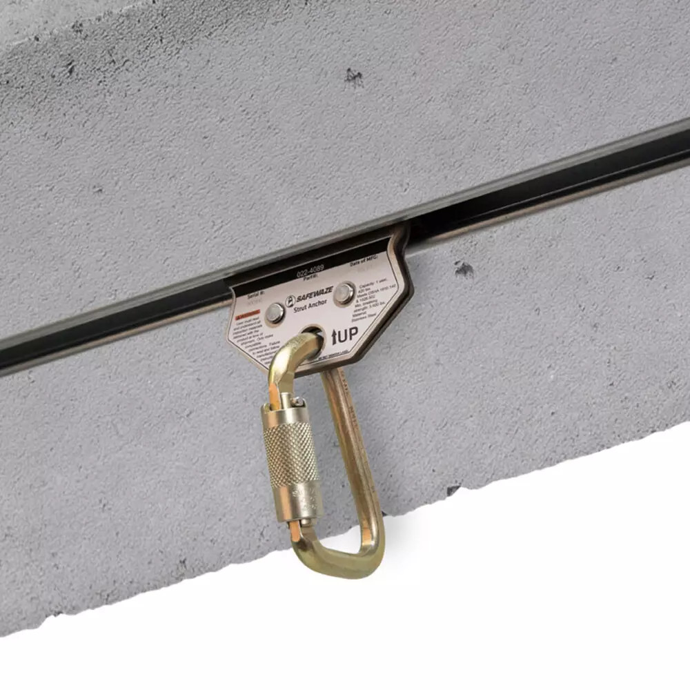 The Strut Anchor has interlocking plates that are fastened together making installation so simple it can be done one-handed. Just slide the 1-piece anchor into the strut and lock plates. Add the carabiner (included) and check connection - the red warning stripes act as clear visual indicators for proper installation. Smooth sliding action allows user to work hands-free.