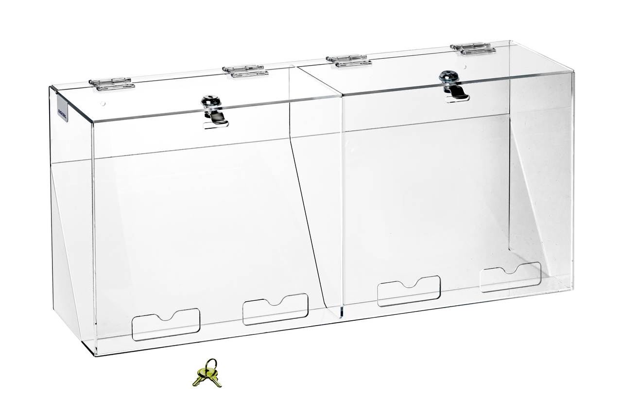 Holds 200 pr Foam Ear Plugs. Also holds Finger Cots and other safety products, each Compartment. Plastic dispensers have slip resistant rubber feet. Unit comes without labels applied. Includes the following labels (stickers): Finger Cots, Hearing Protection (no cord), Hearing Protection (corded), Blank Customizable White Label (that can be written on with pen, marker or self-adhesive laser printed labels). End user selects the appropriate label for their application. Illustrated labels have a caricature showing the item in use, and tri-lingual wording (English, Spanish, French Canadian) to insure worker compliance.