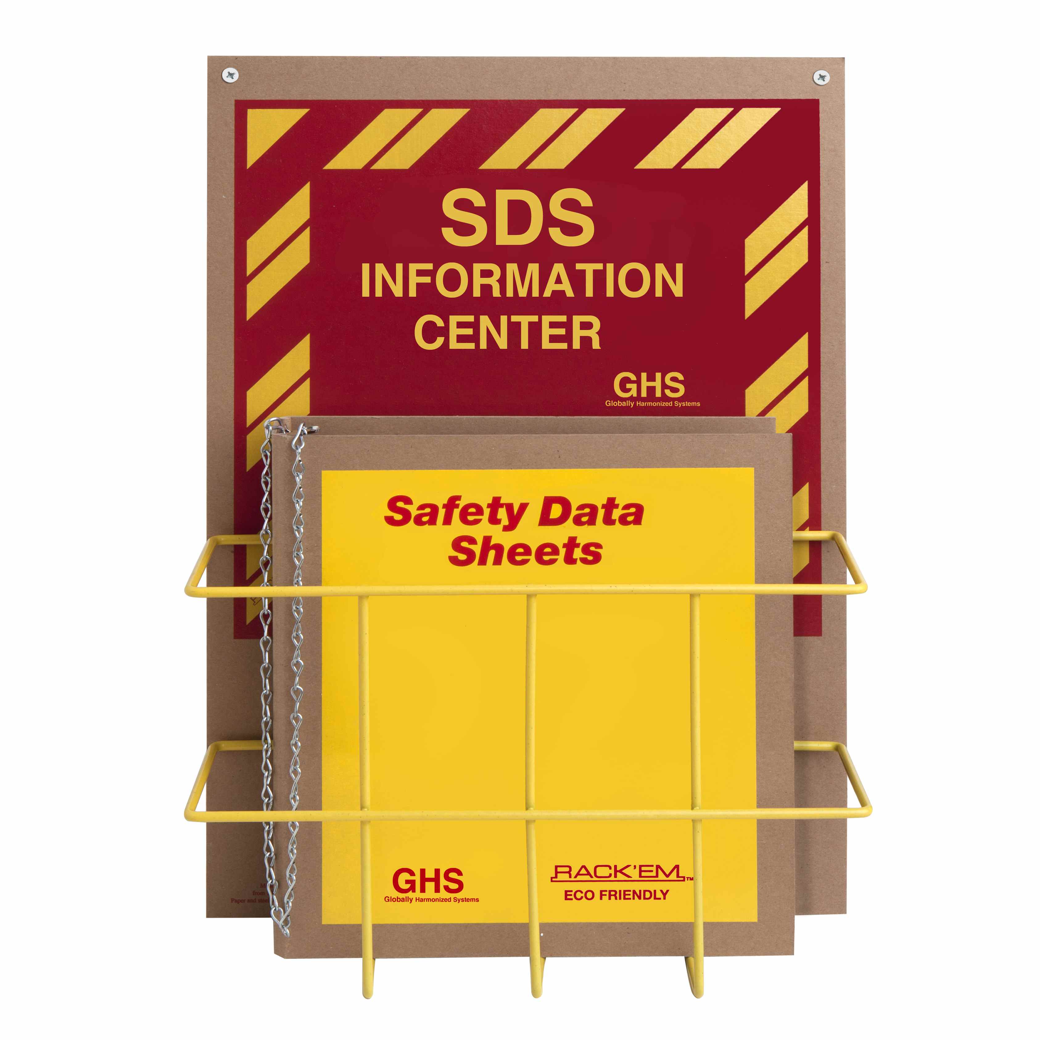 Rack'Em Racks Safety Data Sheets (SDS) Center is Globally Harmonized Systems (GHS) compliant. SDS Center keeps safety data sheets visible, organized, and accessible to all employees. Includes SDS binder with chain, highly visible sign, and wire rack.