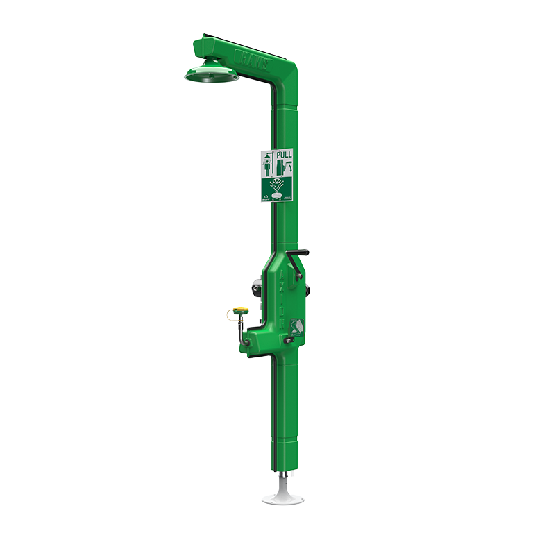 Haws Model 8315CTFP heat traced combination shower and eye/face wash features a unique 3-way valve which reduces the amount of pressurized pipe and non-pressurized standing water, greatly lowering the amount of "dead leg" water in the system resulting in less opportunity for Legionella growth. Also reduced is the packaging foot print allowing for economical and fast UPS shipment. The unit includes the medically acclaimed AXION MSR eye/face wash head assembly. This revolutionary inverted flow design is the only product on the market that provides a medically superior response consistent with all EMT, emergency room and doctors' office protocols by sweeping contaminants away from the vulnerable nasal cavity. Traditional eyewashes irrigate from the outside edge of the eye back toward the nose, where contaminants can then be flushed into the nasal cavity through the lacrimal punctum, nature's ocular cavity drain. AXION MSR also offers a new hydrodynamic shower design that minimizes the strong physical pressure that drives the water to the outer rim making the distribution equal across the entire footprint of the flow. Better use of the water flowing through the shower makes it more effective while providing a more comfortable environment by breaking the streams of water into smaller individual droplets. Built-in safety features include: porting for an optional thermal actuator bleed valve, 120V thermostat cable double wrapped piping, 1 in (2.5 cm) insulation surrounding pressurized piping and outside jacket to prevent freezing, as well as a universal emergency sign.