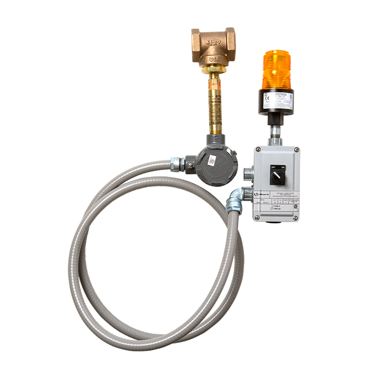 Model 9001 emergency alarm and light system will be operated by a double pole, double throw flow switch, which contains multiple sets of contacts for remote activation and activates an amber flashing light and buzzer at 90 db, audible at 10 feet (304.8 cm) (buzzer can be silenced during testing). Switch will activate at 2.4 gpm (9.1 L). System can be mounted to pipe or wall. Voltage: 120 VAC, 50 or 60 cycles. Supply: 1-1/4" NPT. Model 9001 is CSA electrical certified, TYPE 4. (Equivalent to NEMA 4).