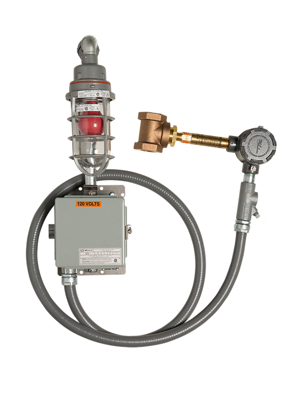 Model 9001ExP Class 1, Division 2, Groups B, C and D emergency alarm and light system features a red flashing light and 90 db at 10 feet (304.8 cm), buzzer that is operated by a double pole, double throw flow switch. Unit is activated when the emergency shower or eyewash is in operation. Switch will activate at 2.4 gpm (9.08 L). System can be mounted to pipe or wall with optional wall bracket that is provided. It is recommended to install unit where a shower or eyewash is in a remote or noisy location where user is unable to summon help. This alarm contains a multiple sets of contacts for remote activation alarm sites. Model is CSA electrical certified, TYPE 4. (NEMA 4 equivalent). Temperature code T2C voltage: 120 VAC, 50 or 60 cycles. Supply: 1-1/4" IPS.