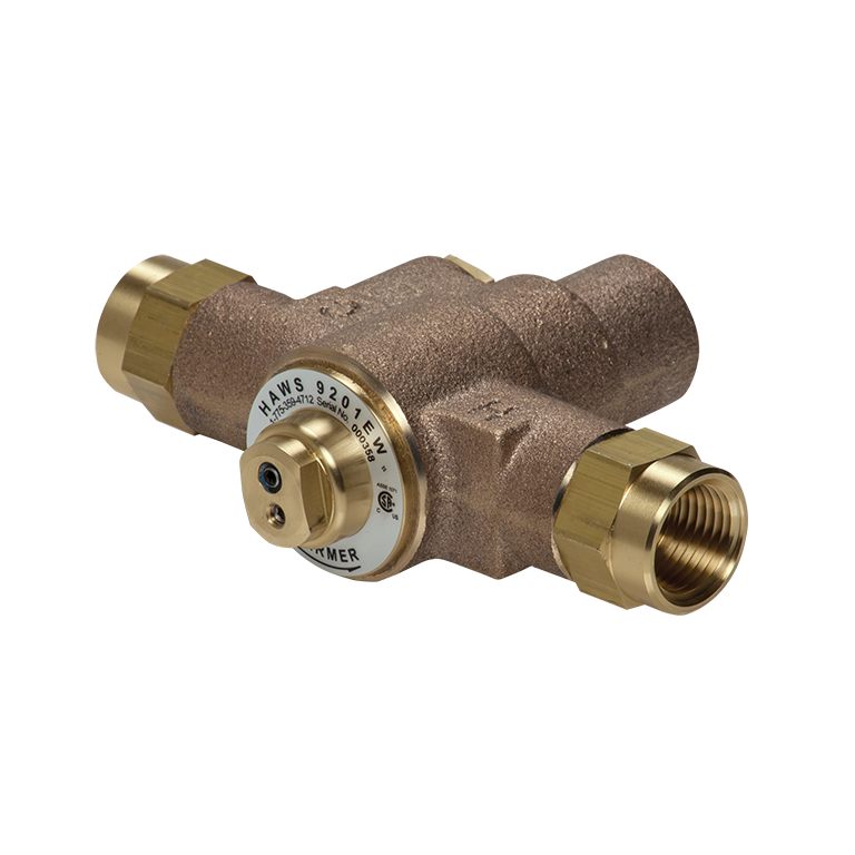 Model 9201EW Emergency valve thermostatically mixes hot and cold water to provide a safe fluid supply for a single emergency eye/face wash. Additionally, to ensure a fail-safe water supply for emergency eyewash stations, a cold water by-pass valves open in the event of hot water pressure loss. (No gauges supplied - ASSE 1071 standard recommends gauges be placed 5 to 8 feet (1.52 to 2.44 m) downstream for the most accurate temperature measurement).