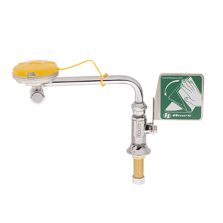 Model 7612 sink or deck mounted eye/face wash features the medically acclaimed AXION MSR stainless steel eye/face wash head assembly (patent pending). This revolutionary inverted flow design is the only product on the market that provides a medically superior response consistent with all EMT, emergency room and doctors' office protocols by sweeping contaminants away from the vulnerable nasal cavity. Traditional eyewashes irrigate from the outside edge of the eye back toward the nose, where contaminants can then be flushed into the nasal cavity through the lacrimal punctum, nature's ocular cavity drain. When not in use, this unit utilizes a swing-away feature so the area stays clear for everyday use.
