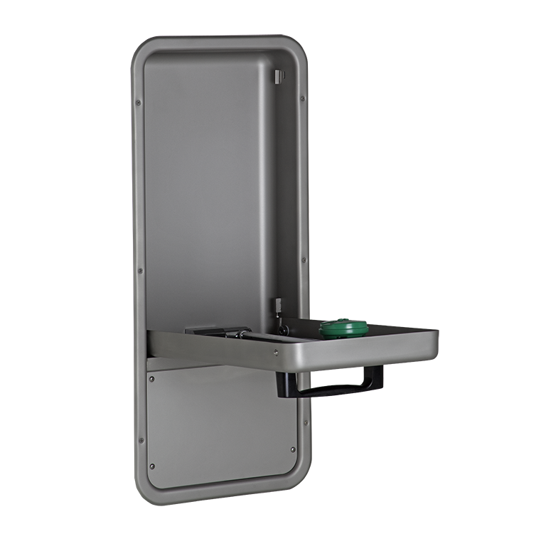 Model 7656WCC barrier-free, recessed eye/face wash features the medically acclaimed AXION MSR eye/face wash head assembly (patent pending). The revolutionary inverted flow design is the only product on the market that provides a medically superior response consistent with all EMT, emergency room and doctors' office protocols by sweeping contaminants away from the vulnerable nasal cavity. Traditional eyewashes irrigate from the outside edge of the eye back toward the nose, where contaminants can then be flushed into the nasal cavity through the lacrimal punctum, nature's ocular cavity drain.