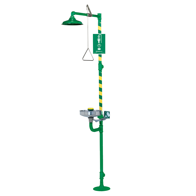 Model 8300CRP-8309CRP corrosion resistant combination shower and eye/face wash features the medically acclaimed AXION MSR eye/face wash head assembly (patent pending). This revolutionary inverted flow design is the only product on the market that provides a medically superior response consistent with all EMT, emergency room and doctors' office protocols by sweeping contaminants away from the vulnerable nasal cavity. Traditional eyewashes irrigate from the outside edge of the eye back toward the nose, where contaminants can then be flushed into the nasal cavity through the lacrimal punctum, nature's ocular cavity drain. AXION MSR also offers a new hydrodynamic shower design that minimizes the strong physical pressure that drives the water to the outer rim of normal showerheads, making the distribution equal across the entire footprint of the flow. Better use of the water flowing through the shower makes it more effective while providing a more comfortable environment by breaking the streams of water into smaller individual droplets.