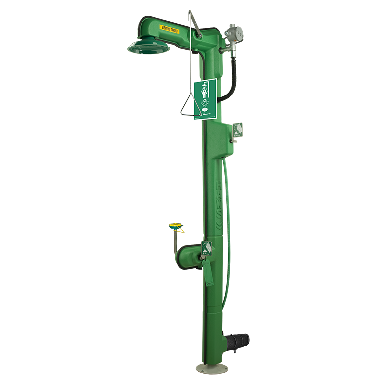 Haws Model 8317CTFP heat traced combination shower and eye/face wash features the medically acclaimed AXION MSR eye/face wash head assembly (patent pending). This revolutionary inverted flow design is the only product on the market that provides a medically superior response consistent with all EMT, emergency room and doctors' office protocols by sweeping contaminants away from the vulnerable nasal cavity. Traditional eyewashes irrigate from the outside edge of the eye back toward the nose, where contaminants can then be flushed into the nasal cavity through the lacrimal punctum, nature's ocular cavity drain. AXION MSR also offers a new hydrodynamic shower design that minimizes the strong physical pressure that drives the water to the outer rim making the distribution equal across the entire footprint of the flow. Better use of the water flowing through the shower makes it more effective while providing a more comfortable environment by breaking the streams of water into smaller individual droplets. Virtually eliminating mishaps, the unit's safety features include: a thermal actuator bleed valve, 120V thermostat cable double wrapped piping, 3/4 in (1.9 cm) insulation surrounding piping and UV protected outside jacket to prevent freezing, as well as a universal emergency sign.