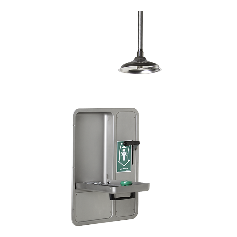 Model 8356WCC barrier-free, wall-mounted, fully recessed combination shower and eye/face wash features the medically acclaimed AXION MSR eye/face wash head assembly (patent pending). The revolutionary inverted flow design is the only product on the market that provides a medically superior response consistent with all EMT, emergency room and doctors' office protocols by sweeping contaminants away from the vulnerable nasal cavity. Traditional eye washes irrigate from the outside edge of the eye back toward the nose, where contaminants can then be flushed into the nasal cavity through the lacrimal punctum, nature's ocular cavity drain. Emergency combination unit is equipped with a stainless steel drain pan, so when the irrigation process begins, the unit is draining waste properly. AXION MSR also offers a new hydrodynamic shower design that minimizes the strong physical pressure that drives the water to the outer rim of normal showerheads, making the distribution equal across the entire footprint of the flow. Better use of the water flowing through the shower makes it more effective while providing a more comfortable environment by breaking the streams of water into smaller individual droplets.