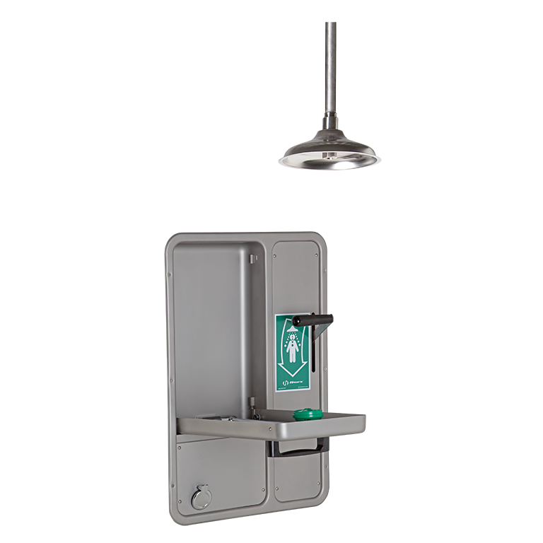 Model 8356WCDD barrier-free, wall-mounted, fully recessed combination shower and eye/face wash features the medically acclaimed AXION MSR eye/face wash head assembly (patent pending). The revolutionary inverted flow design is the only product on the market that provides a medically superior response consistent with all EMT, emergency room and doctors' office protocols by sweeping contaminants away from the vulnerable nasal cavity. Traditional eye washes irrigate from the outside edge of the eye back toward the nose, where contaminants can then be flushed into the nasal cavity through the lacrimal punctum, nature's ocular cavity drain. Emergency combination unit is equipped with a stainless steel drain pan, so when the irrigation process begins, the unit is draining waste properly. AXION MSR also offers a new hydrodynamic shower design that minimizes the strong physical pressure that drives the water to the outer rim of normal showerheads, making the distribution equal across the entire footprint of the flow. Better use of the water flowing through the shower makes it more effective while providing a more comfortable environment by breaking the streams of water into smaller individual droplets.