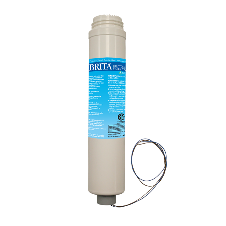 Model 6429 Brita Hydration Station replacement filter is used on the Brita Hydration Station and is tested and certified by CSA against NSF/ANSI standard 42 for the reduction of chlorine (taste and odor) and against NSF/ANSI standard 53 for the reduction of lead and 99.99% of cysts. It is a carbon block filter cartridge with a service life of 1 year/2,500 gallon (9463 L). Filter contains an onboard chip to store total gallon usage; this chip interfaces with an electronic Lifecycle Control system to allow water flow only until the filter reaches its total gallon capacity.