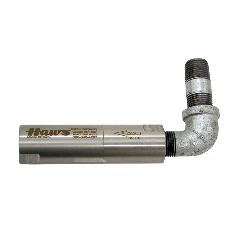 Model SP157A is a scald protection bleed valve. Recommended for high ambient temperature locations where extreme heat or hot sun might cause internal water overheating. Flushes water through line when internal water temperature reaches 98 deg F (36.7 deg C) and closes at 95 deg F (35 deg C). Full open temperature is 105 deg F (40.6 deg C). 1/2 in NPT inlet and outlet.