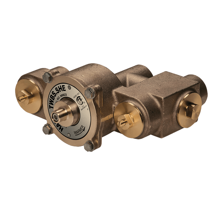 Model TWBS.SHE, low-lead emergency valve (patent pending), thermostatically mixes hot and cold water to provide a safe fluid supply for emergency shower and eyewash equipment. The valve contains a secondary high temperature limit valve to provide additional protection to the user in the event of main tempering valve malfunction. Additionally, to ensure a fail-safe water supply for emergency shower and eyewash stations, a series of cold water by-pass valves open in the event of hot water pressure loss. (No gauges supplied - ASSE 1071 standard recommends gauges be placed 5 to 8 feet (1.52 to 2.44 m) downstream for the most accurate temperature measurement).