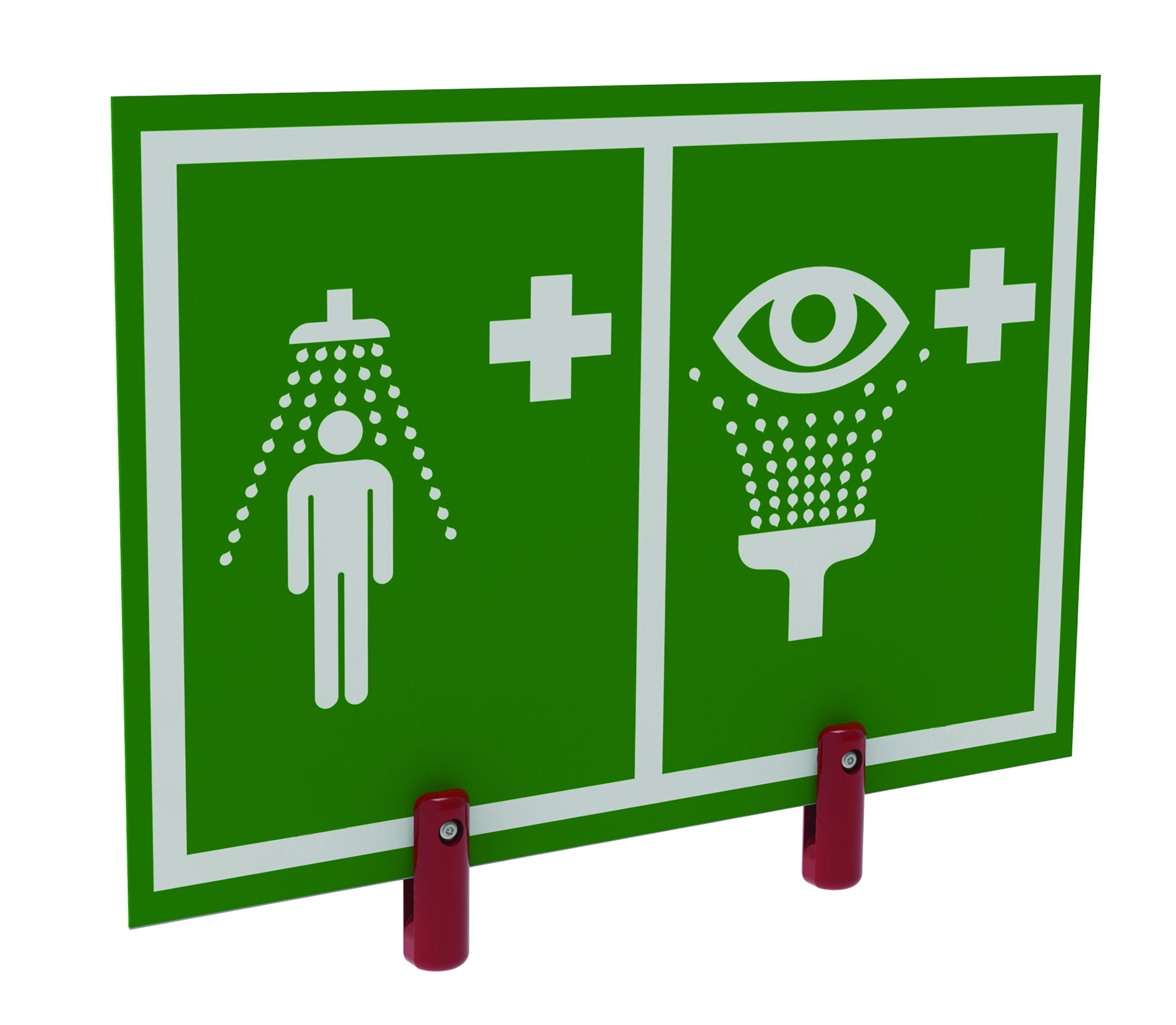 Universal pictogram safety shower and eye/face wash sign with brackets for outdoor showers with insulation. Designed to meet international standard BS EN ISO 7010, these durable PVC signs are white on a green background.