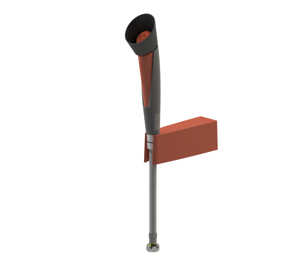 Wall mounted handheld drench hose features an in-line single nozzle for hazardous environments where there is a risk of small spillages of chemicals or dangerous substances. Includes an inspection record tag for recording test and service history.
