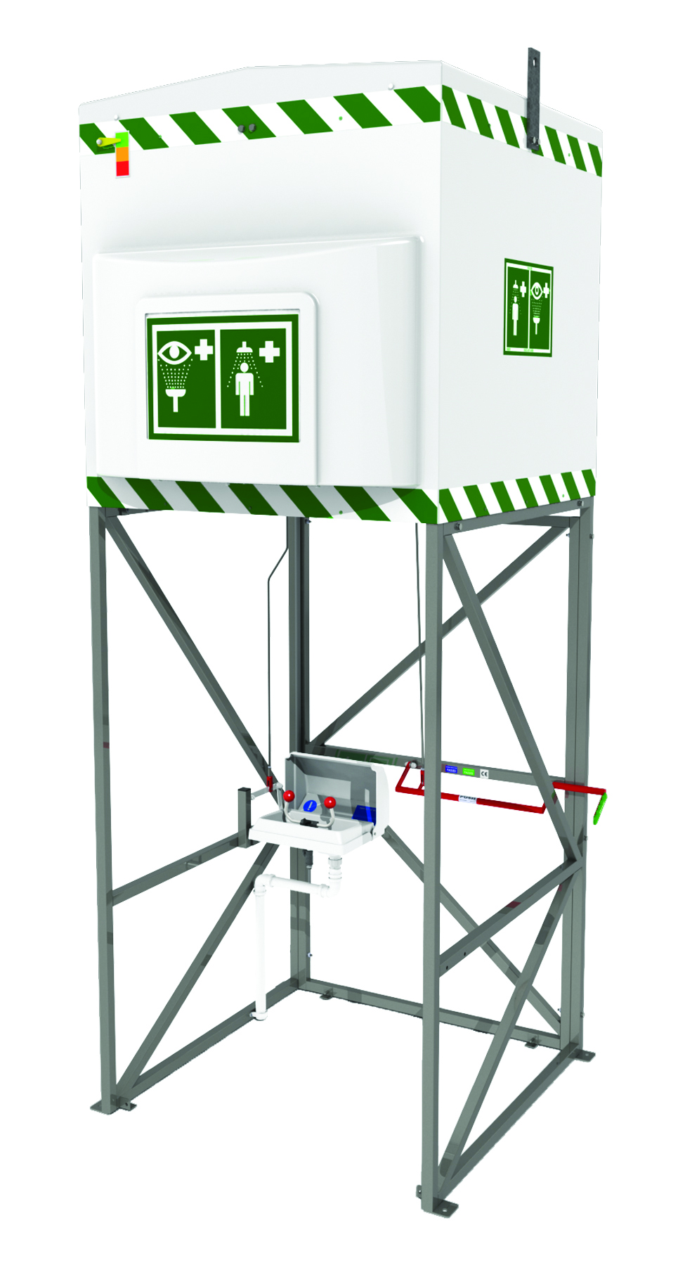 Emergency tank showers are essential to providing safe working conditions where insufficient water pressure exists or when it is impractical to use a plumbed safety shower. The 317 gallon (1200 liter) model provides tepid water even when there is no mains water supply. An integral immersion heater, 110V general purpose rated, controlled by a dual safety thermostat, maintains the water in the insulated tank at a constant tepid temperature. In an emergency, the shower activates quickly with a simple push of the panic bar. Intended for use in applications within a temperature range of 14°F(-10°C) to 104°(40°C). Assembly required. Electrical supply: 110V Single Phase, 60/50Hz Note: This tank shower is ANSI compliant for the 15 minute time requirement only when connected to a plumbed water source.