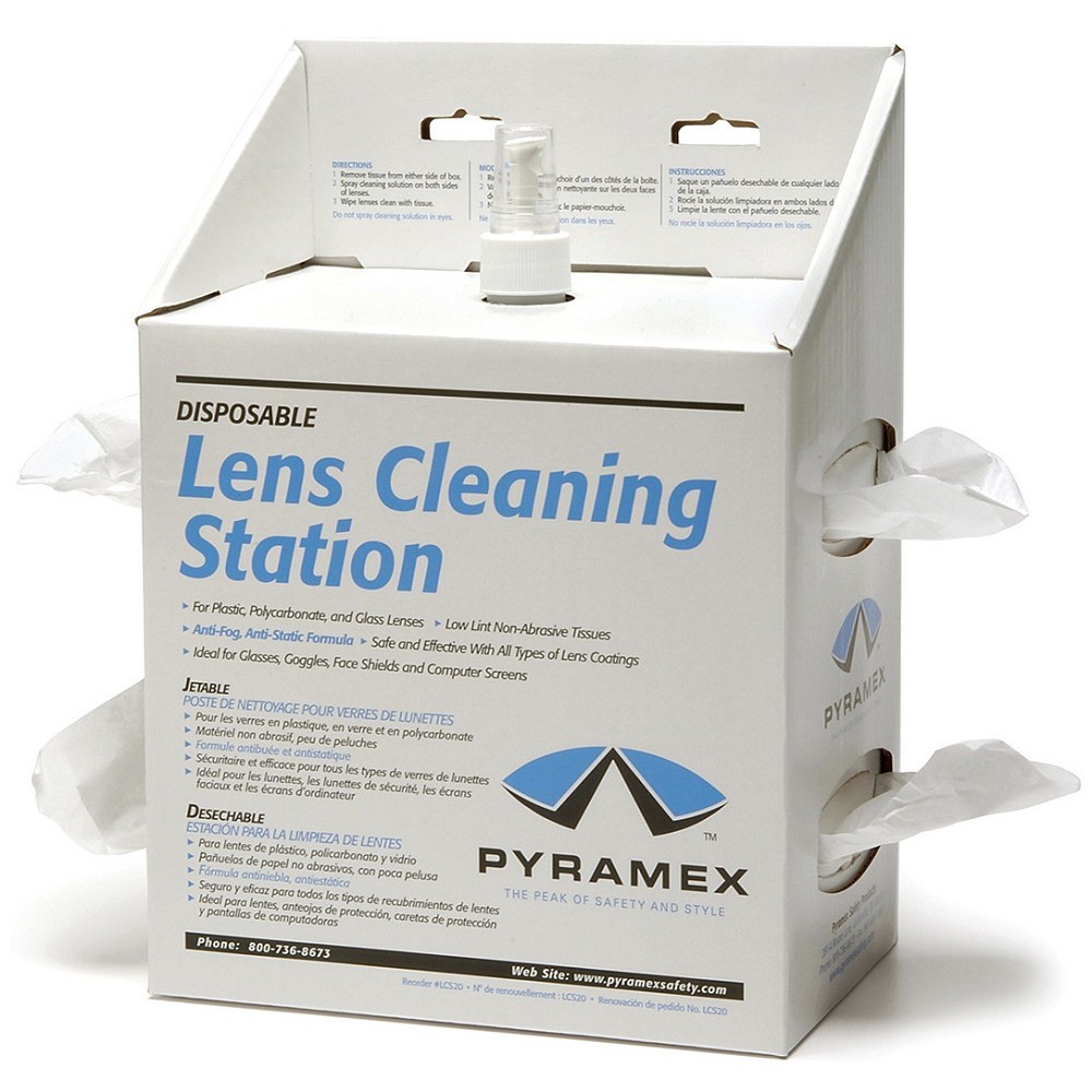 Make keeping your safety eyewear clean a snap with this lens cleaning station from Pyramex. Each station includes an 16 oz. bottle of cleaning solution and 1200 cleaning tissues.