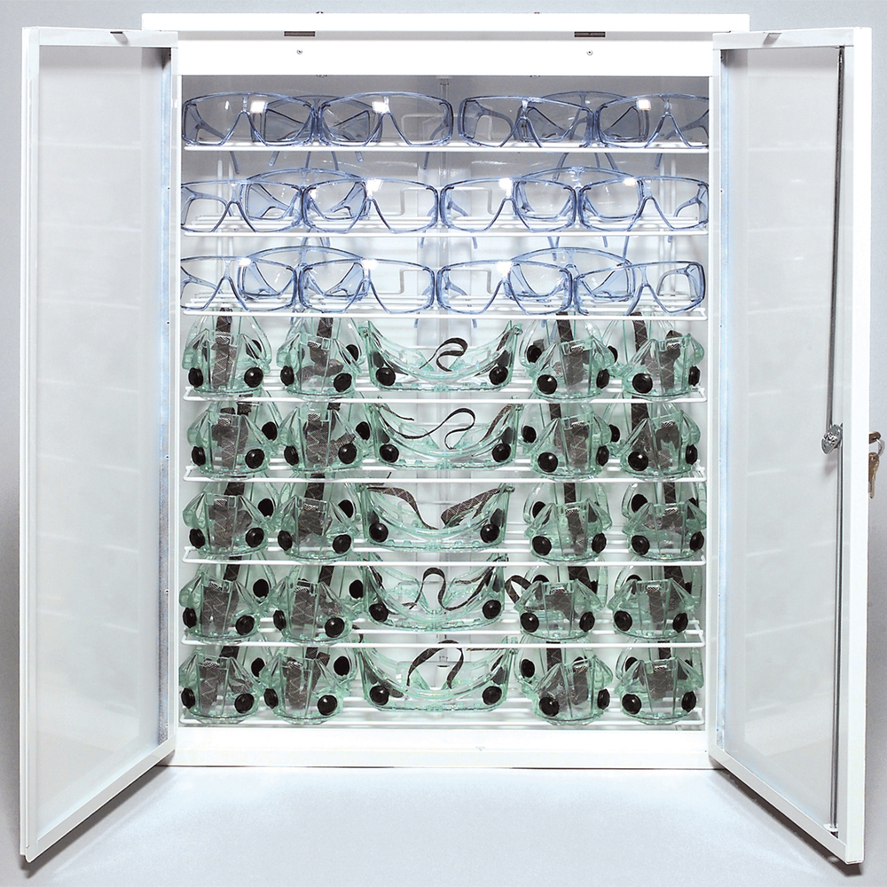- Can accommodate up to 5 goggles, 6 safety glasses or 4 face shields at one time