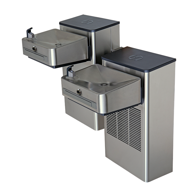 Model 1202SFH touchless indoor wall mount ADA Hi-Lo stainless steel filtered water cooler shall include an ASHRAE compliant, hermetically sealed R-134a refrigeration system with adjustable thermostat. Unit features a unique, modern Hi-Lo (dual fountain) design with stainless steel outer shell. Energy savings feature powers down refrigeration system after 60 minutes of non-use and the lights shut off and will automatically start again when used. The 3000-gallon (11,356 L) filter with electronic lifecycle control turns water off when capacity is reached. Flow will begin again when new filter is installed. The system includes sensor operated solenoid valves for hands-free operation. A pressure regulator is used to adjust incoming water pressures. supplied .45 gpm self-regulating, anti-rotational bubbler heads with flexible antimicrobial mouth guards and instantaneous tankless water cooler for consistent cool water. 115 Volts, 60Hz, rated watts: 350, full load amps: 5. Dimensions: (L x W x H) 18-3/4 x 34-1/16 x 31-3/4".