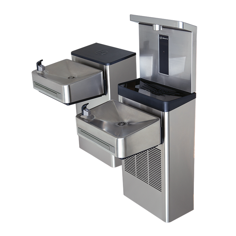 Model 1212S indoor wall-mount ADA Hi-Lo stainless steel water cooler and bottle filler shall include an ASHRAE compliant, hermetically sealed R-134a refrigeration system with adjustable thermostat. Unit features a unique, modern Hi-Lo (dual fountain) design with stainless steel outer shell. Energy savings feature powers down refrigeration system after 2 hours of non-use and the lights shut off and will automatically start again when used. The unit can also be programmed to shut down during planned facility closures, weekends, etc. Digital LED interface keeps user appraised of programming and error codes. Bottle filler basin drains directly to the units waste. The system includes electronic front push bar controlled solenoid valves, .45 gpm self-regulating, anti-rotational bubbler heads with flexible antimicrobial mouth guards, bubbler head deactivation feature, bottle filler auto purge every 24 hours, instantaneous tankless water cooler for consistent cool water and LED illuminated bottle fill area. 115 Volts, 60Hz, rated watts: 350, full load amps: 5. Dimensions: (L x W x H) 18-3/4 x 34-1/16 x 40-3/4".