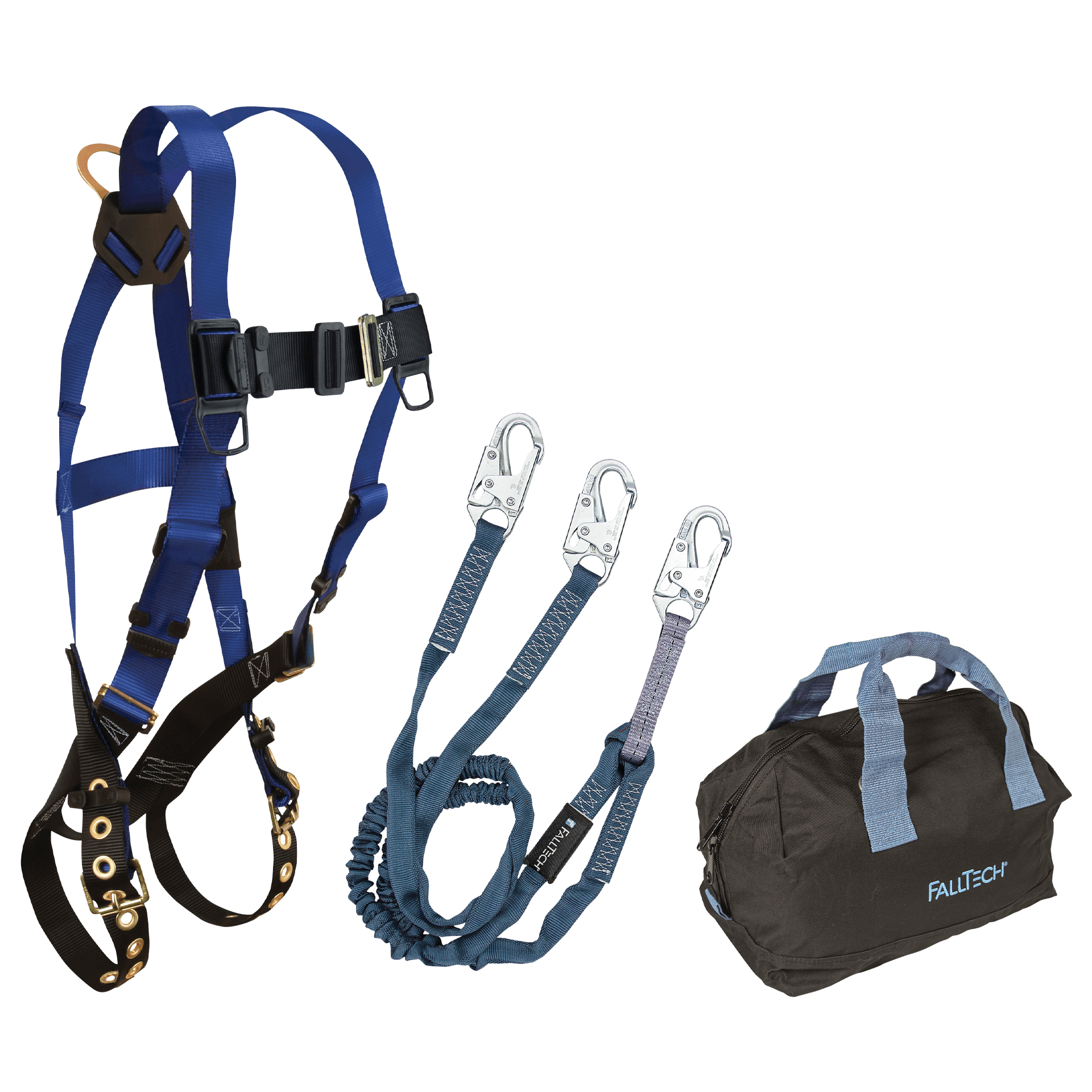 18 unique work-safe solutions to suit most user applications are provided in prepacked kits. Contractor and FT Basic harnesses with one or three D-rings are outfitted with energy absorbing lanyards and gear storage bags. Harnesses feature mating buckle or tongue buckle options, lanyards are available with single or double-legs and snap or rebar hooks and each kit includes a gear storage bag conveniently sized for prepacked contents.