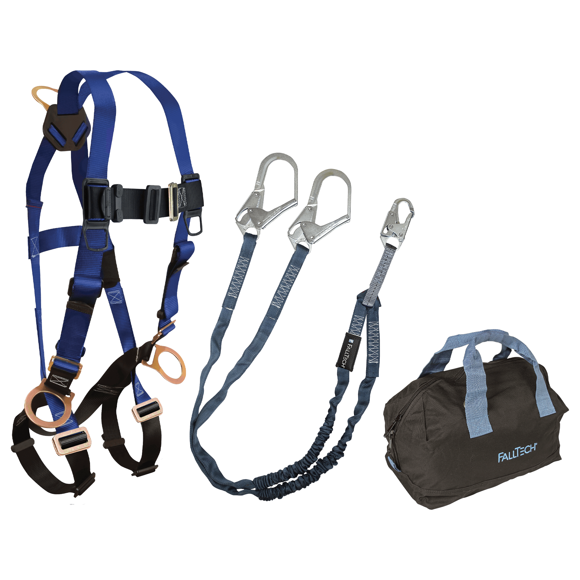 18 unique work-safe solutions to suit most user applications are provided in prepacked kits. Contractor and FT Basic harnesses with one or three D-rings are outfitted with energy absorbing lanyards and gear storage bags. Harnesses feature mating buckle or tongue buckle options, lanyards are available with single or double-legs and snap or rebar hooks and each kit includes a gear storage bag conveniently sized for prepacked contents.