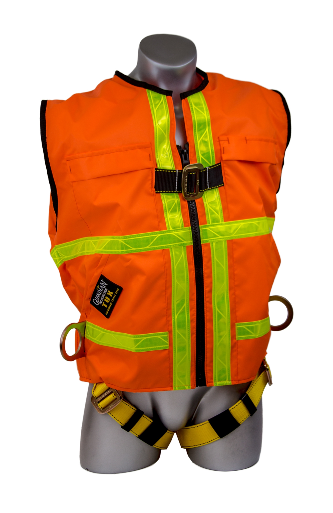 Featuring the utmost in efficiency and utility, the Construction Tux Harness will save both you and your bottom line from harm. Equipped with side D-rings that make it ideal for work positioning applications, the Construction Tux is ideal for concrete or rebar contractors. The fall protection harness is also sewn into an external vest, which reduces the possibility for tangling or contamination of harness webbing.
