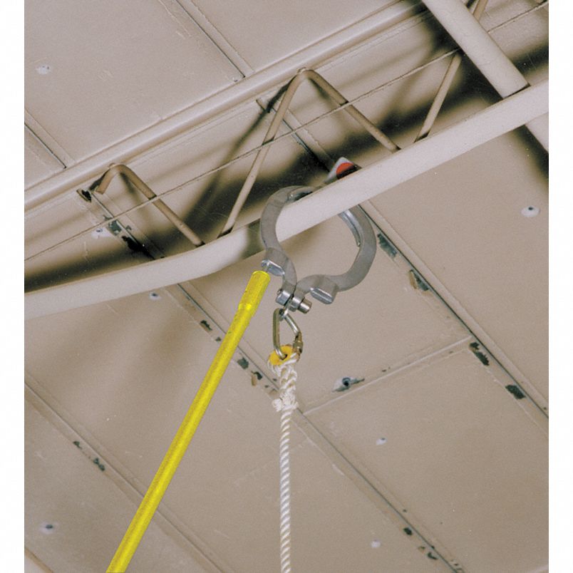 These extended-reach pipe anchor kits have a spring-loaded clip that fastens around a pipe or other structural component that is out of reach. This allows workers to secure an anchor point that's out of reach without installing additional, temporary anchor points. Anchors should always be inspected and replaced after being exposed to a fall.