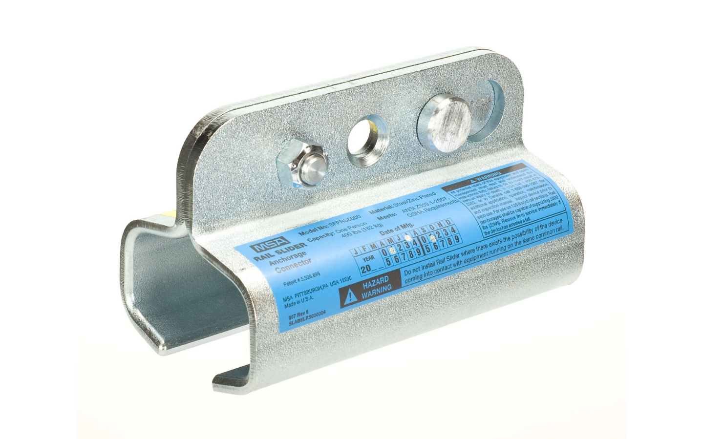 The rail Slider Anchorage connector will move along the rail, pulled by the worker's lanyard/harness. No unhooking and re-hooking of the lanyard is required when changing work locations. The rail slider consists of a pair of rail profile plates, which interlock via a set of receiving bolts. A lanyard is attached to an approved carabiner securing the profile plates to the crown of the rail.
