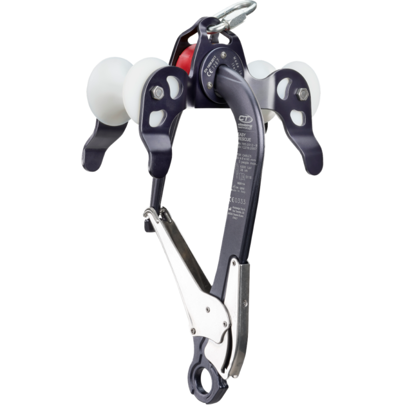 EASY RESCUE is a pulley and anchorage point for evacuations of rope systems, which allows access from the rescuer via the wire rope or a suspended rescue rope section at the anchorage point. The wire rope must have a diameter between 20 and 60 mm and a maximum inclination of 50 deg . The opening is a double snap to increase safety during use. In addition, the light weight and good balance allow one-handed use. The high breaking load is conferred by the structure of the fastener. Furthermore, the central track roller acts as a safety roller that activates under load. The protruding sheave support allows better restriction of the wire rope. In addition, the upper anchor point allows the rope to move without interfering.
