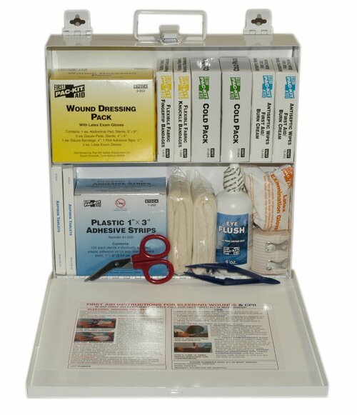 Weatherproof First Aid kit with a plastic case. Gasket seal keeps contents free of dust and moisture. Neat, orderly interior packaging, makes contents easy to locate and use. OSHA compliant box has easy carry handle or is wall mountable.