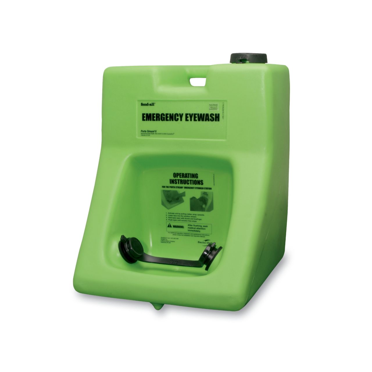 Offers versatile portability and 15-minutes of uninterrupted flushing without costly plumbing. Fendall porta stream's simplicity of installation and operation has made it a popular choice. Fendall porta stream ii offers versatile portability and 15-minutes of uninterrupted flushing without costly plumbing. Fendall porta stream's simplicity of installation and operation has made it a popular choice. Self-contained: it features a nozzle strap that is easily removed to activate flushing: leaving hands free to hold eyelids open. Can be easily and affordably placed near most workplace hazards with single bracket mounting device or transported with optional universal cart or universal stand. Molded handle accepts hanging bracket for vertical or horizontal surface installation