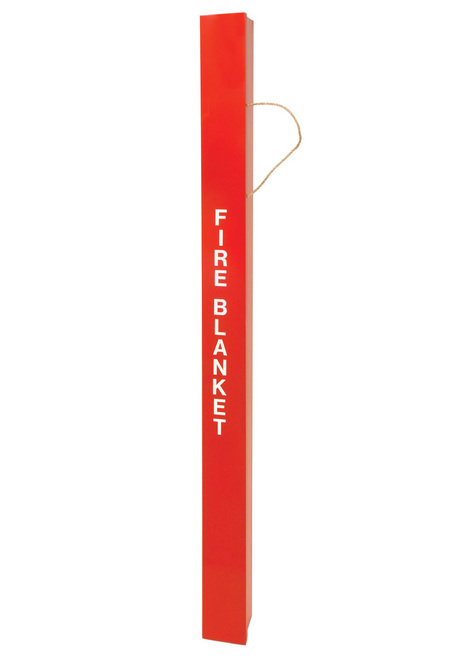 Steel Cabinet (JSA-1010-CW) ready for wall mounting. Cabinet is bright red enamel with white lettering. Viewing hole provided to see if blanket is in place.