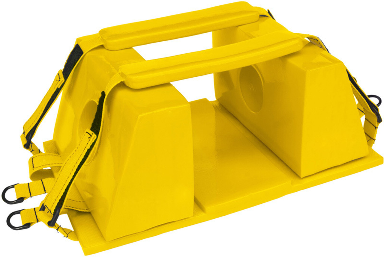 Make sure head immobilizer is taken apart. (1) Base plate, (2) head blocks and (2) head/chin straps. Place base plate against top of spineboard with attached straps stretched out. The straps attached to the base plate loop over and then through the handle running the strap in-between the board and the base plate. The run strap through and over other handle and attach strap to Velcro on base plate. Repeat with 2nd strap. Attach retention strap at top of base plate by looping through center hole of spine board. Attach head blocks to Velcro and place head/chin straps over blocks and loop Velcro ends through D rings on base plate. Securing the patient in the Head Immobilizer: Position the patient on the backboard so that their head is positioned in the middle of the base plate. Secure the patient on the backboard with restraining straps. Place the head blocks against each side of the patients head. When possible align the holes in the head blocks with the patient's ears so you can hear the patient. Loop each end of the forehead/chin straps through the D rings. Tighten as needed. The head immobilizer is vinyl coated and is both buoyant and waterproof.It can be left in place during X-rays.