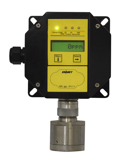 The SE-5175 Series Sensor/Transmitters utilize electrochemical type cells to detect the target gas. These cells consist of electrodes, electrolyte and an air/liquid separation barrier. Gas molecules enter the cell and, as a result of an oxidation/reduction reaction, generate an electrical current proportional to the gas concentration. This current is measured, conditioned, converted to the gas concentration, digitally displayed and transmitted as a 4-20 mA output signal. ENMET offers a variety of multi-channel controller/alarm modules that provide the 24 VDC power and receive the 4-20 mA signal from the sensor/transmitters. These sensor/transmitters can also be connected to various computer-based instrumentation, PLCs, etc.