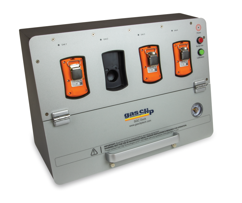 Gas Clip Single Gas Clip Dock (SGC Dock) is an all in one docking station designed for maximum testing efficiency and portability. Housed in a rugged case with robust USB memory, this station will be able to accurately test and record all monitor data while reducing the testing time and gas usage. Traditional docking stations are only designed to test one instrument at a time, resulting in time consuming testing periods as well as unnecessary usage of testing gas. Gas Clip has significantly improved both testing time and test gas usage with the SGC Dock; users can now test 4 instruments simultaneously saving both time and money.