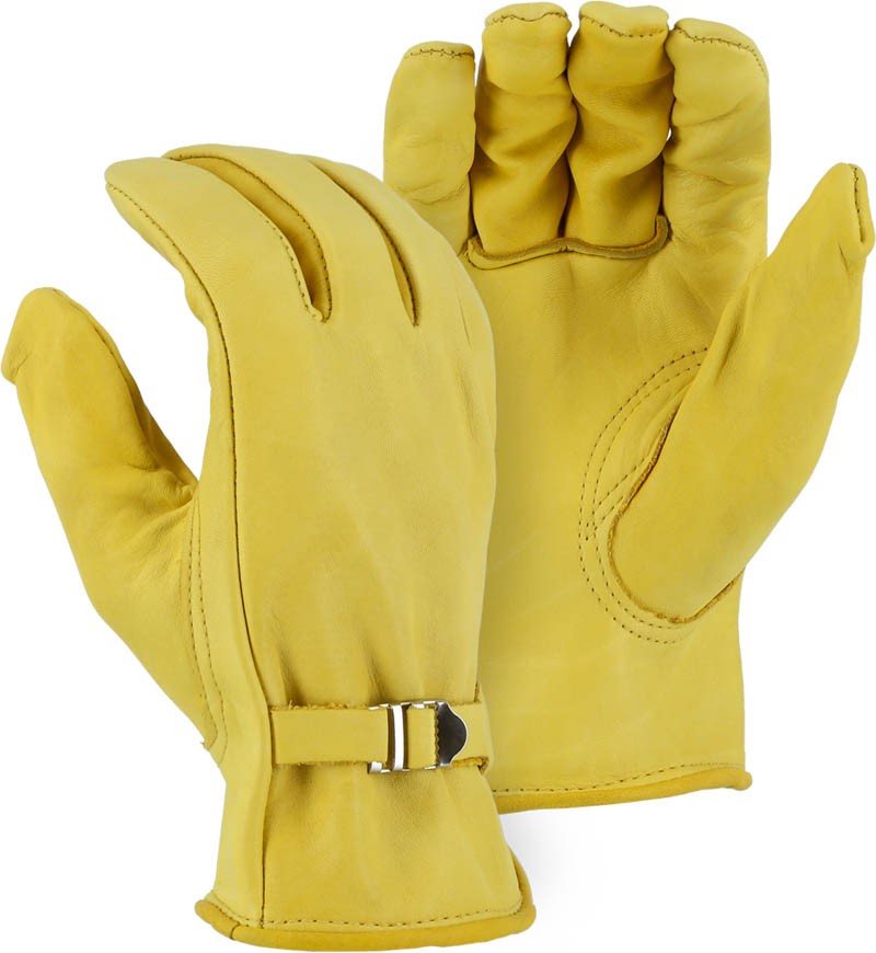 Cowhide drivers glove with wrist strap, Top grain A-grade cowhide grain leather driver with keystone thumb, double stitched leather hem, and shirred back.