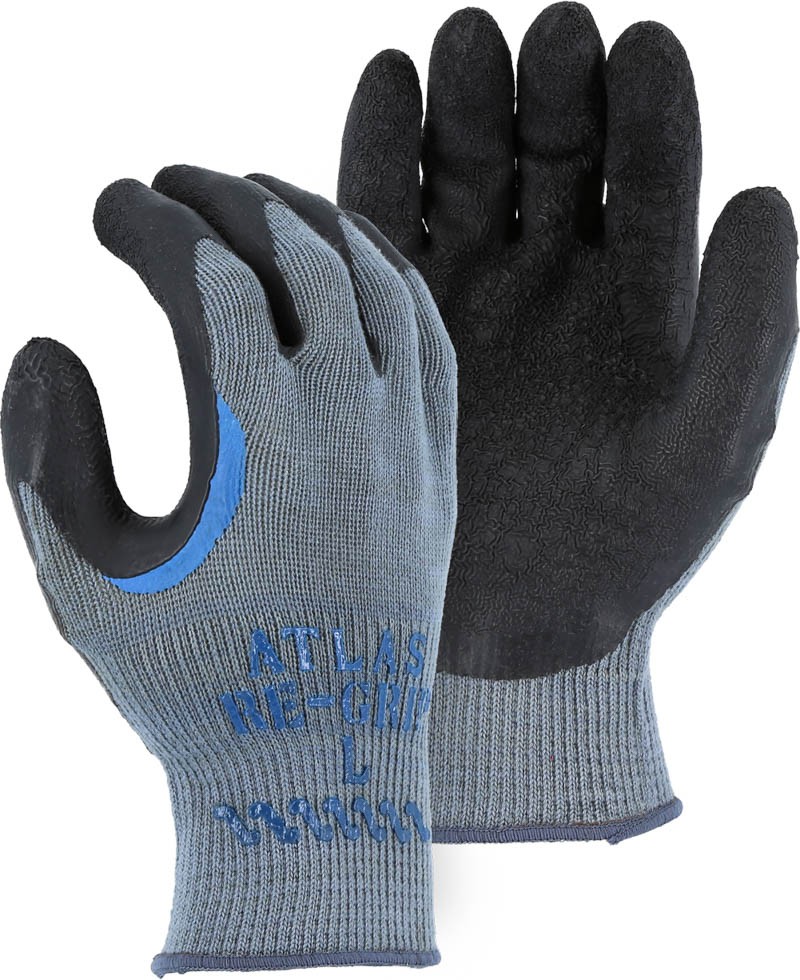 Atlas 330 re-grip, reinforced thumb crotch, black latex over blue latex on gray seamless knit liner. Excellent quality all-purpose work glove for applications requiring comfort, versatility and the features of a palm coated glove. Excellent alternative to leather and cotton for wet or dry applications.