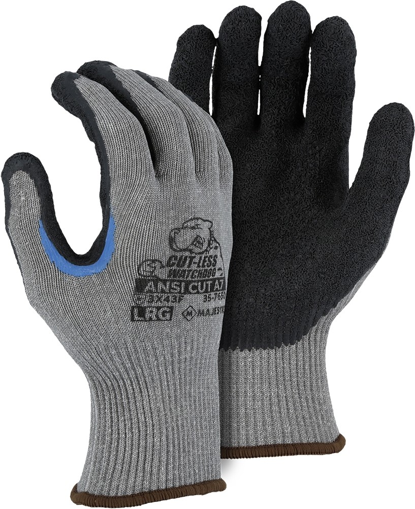 The 35-7650 by Majestic is a box of 12 pair ANSI A7 cut level watchdog gloves that feature a crinkle latex palm. These 13 ga seamless knit gloves feature a premium crinkle latex coating for superior durability and grip. Other features include a double-dip thumb crotch and a long knit cuff for a more secure fit. These cut resistant gloves meet ANSI Cut Level A7 and EN Cut Level F standards for protection.
