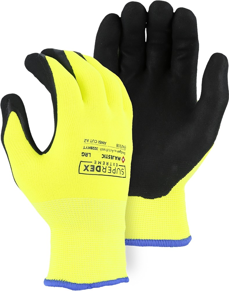 Supered 3228HYT palm coated cold weather gloves with a heavyweight thermal liner. Cold weather 15 ga high visibility nylon outer liner. Insulated brushed 10 gauge acrylic liner with foam nitrile palm dip coating. The Hi Vis Superdex Thermal Gloves w/Nitrile Palm feature 15 ga nylon shell with 10 gauge acrylic liner for warmth.