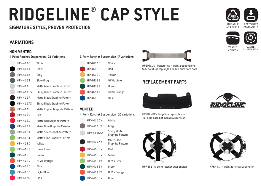 Discover the ultimate in head protection with the Ridgeline Cap Style hard hat. Its ABS shell delivers superior impact resistance and lightweight comfort, while the low-profile design ensures a modern, comfortable fit. Universal accessory slots make it easy to attach additional gear, and the adjustable 4-point or 6-point ratchet suspension fits sizes 6.5 to 8 securely.