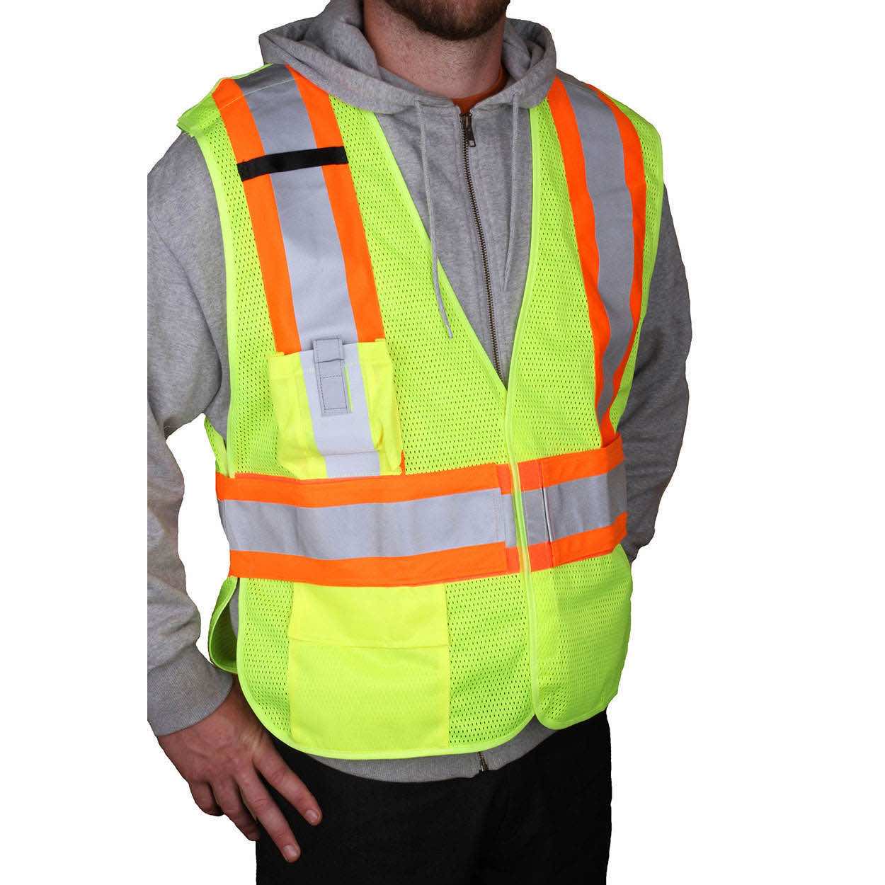 Majestic Class 2 Safety Vest has breakaway Velcro closures at the shoulders, waist and front to help quick and easy tear off. In the case vest becomes snagged on traffic or machinery. High visibility mesh with a radio pocket, grosgrain and reflective X-back striping - Visible over approximately 100 yards.